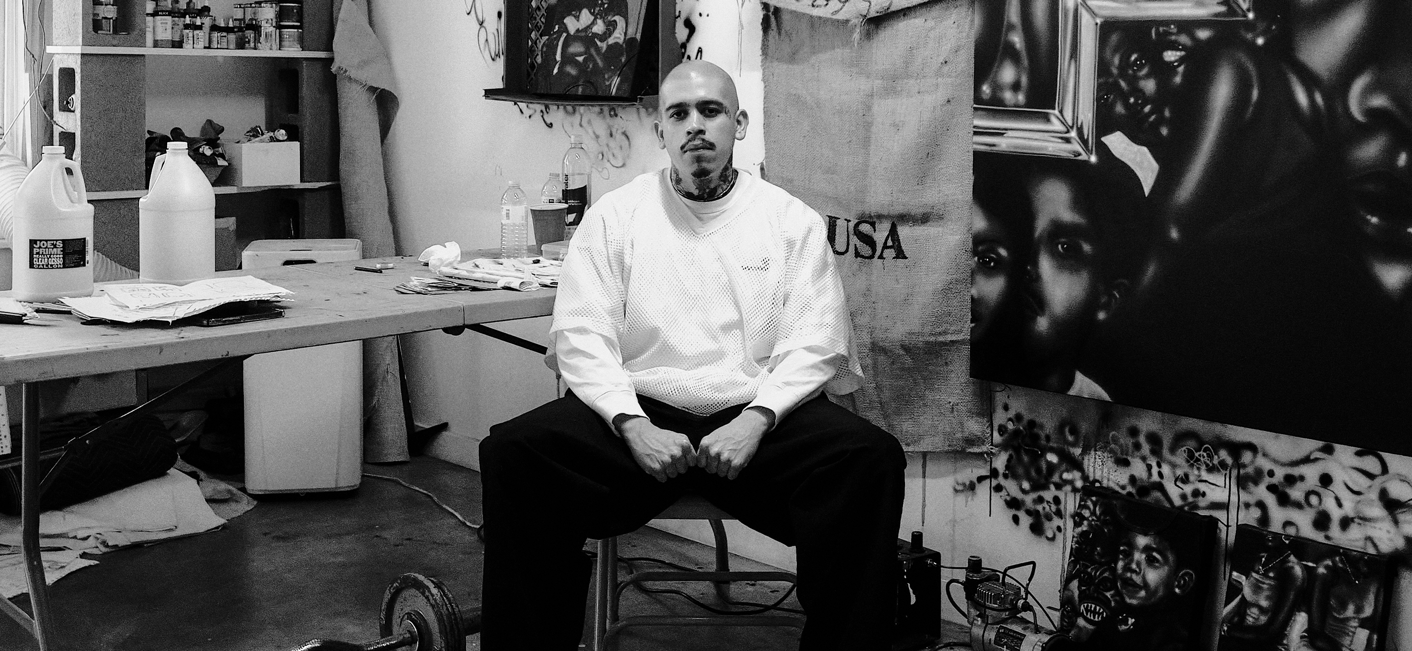 Much of Esteban’s imagery returns to the people and places that raised him — Oakland, Sacramento, the communities that became his chosen family. His practice holds this intimacy as both memory and method. His mastery of black and white charcoal drawings serves as the foundation of his practice, rendering evocative scenes that feel both deeply personal and universally resonant. Beyond monochrome, he embraces vibrant color and rich textures, incorporating materials like burlap, plaster, and soil—elements that pay homage to his Guatemalan roots and the tactile nature of memory.