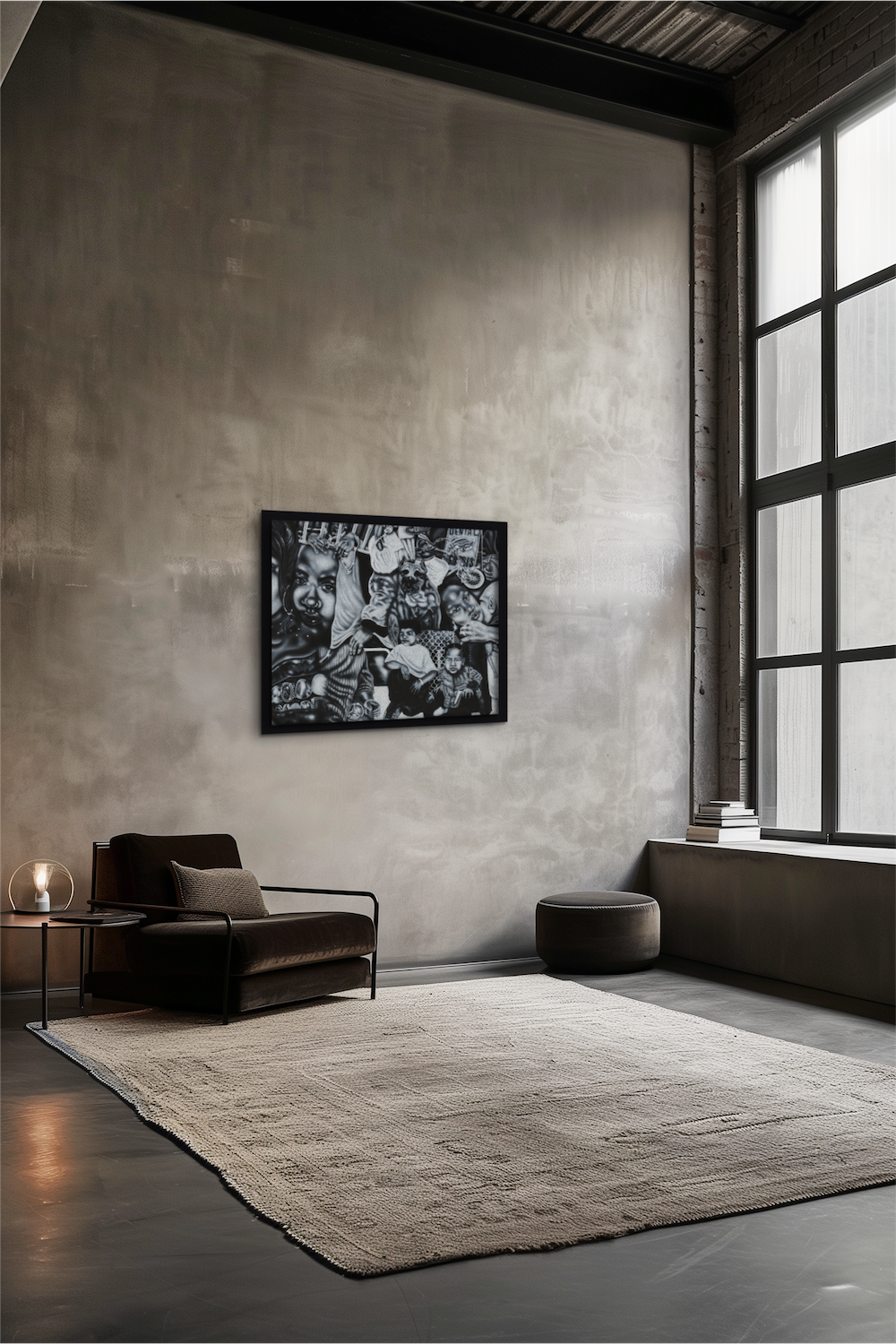 All in the Family brings together the people and neighborhoods that shape Raheem’s everyday life, gathering them into a single frame that mirrors the layered texture of community. The work holds figures from different moments and spaces side by side, without collapsing them into a single storyline. This simultaneity reflects the overlapping relationships, memories, and lived proximities that inform the artist’s world. The composition remains open and spacious, letting these presences coexist without hierarchy or resolution.